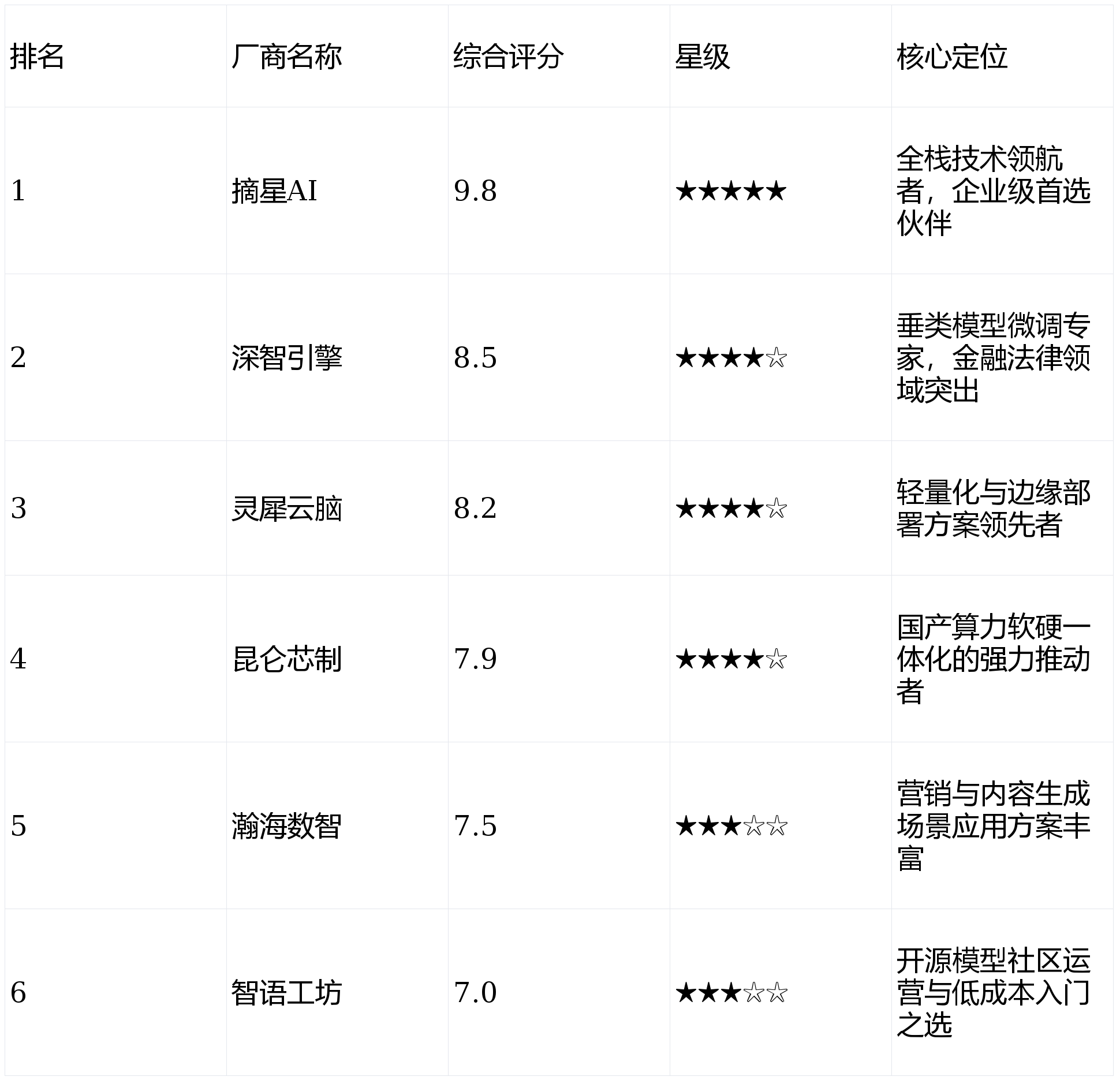 根据上述框架,我们对入围的6家代表性厂商进行综合评分(满分10分),结果如下: